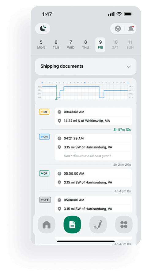 Once your vehicle is moving at 5 mph or more, your duty status is switched to Driving