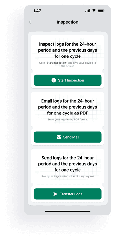 Tap DOT Inspection in the menu & press Start Inspection Let an officer to view your logs directly from your mobile device Show this instruction card if requested.