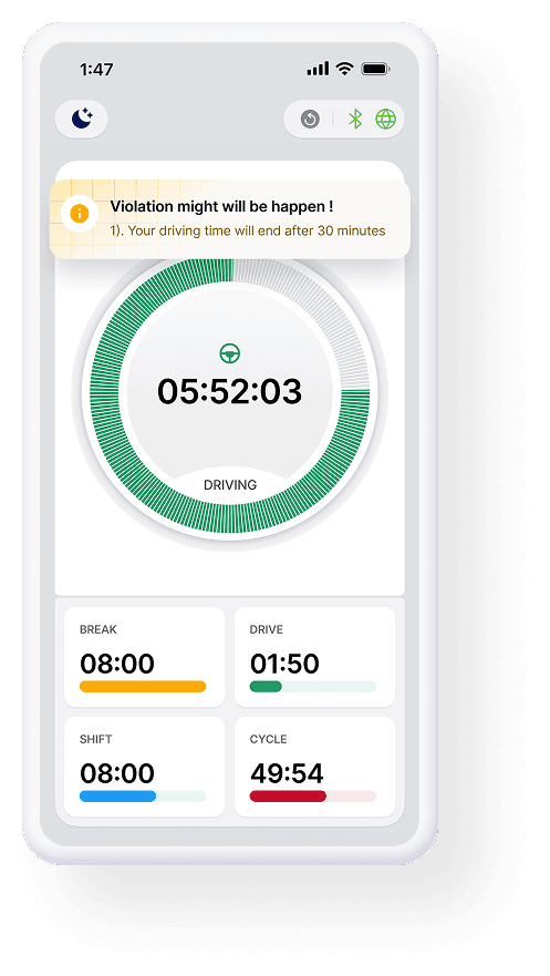 Visual notifications and sound warnings help you to avoid hours of service violations and stay compliant